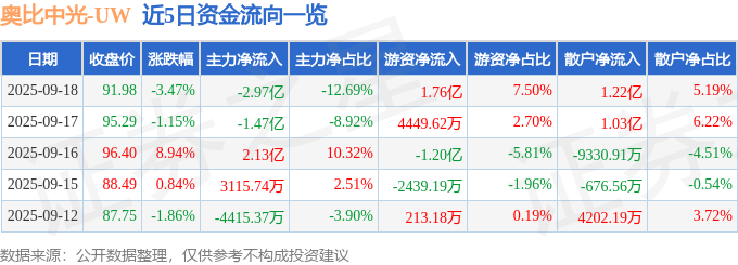 证券之星消息,截至2025年9月18日收盘,奥比中光(688322)报收于91.98元,下跌3.47%,换手率8.46%,成交量24.73万手,成交额23.43亿元。