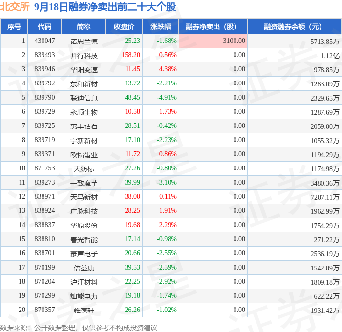 北交所融券净卖出前三分别为:诺思兰德(430047)融券净卖出3100股,前20具体见下表: