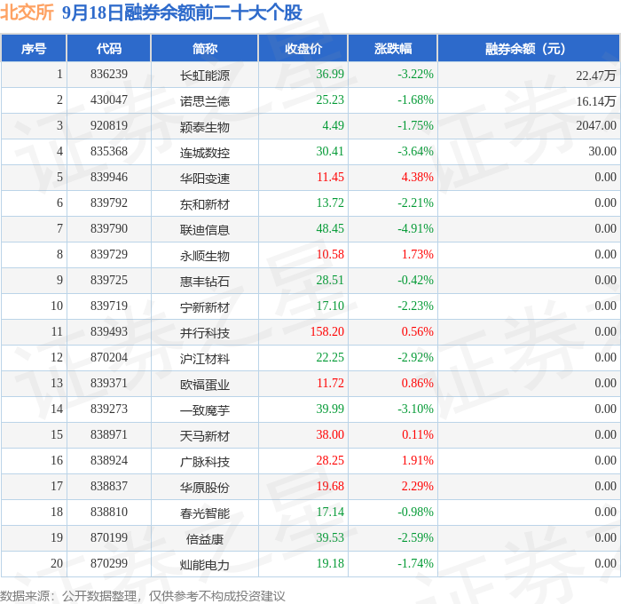 北交所融券余额前三分别为:长虹能源(836239)融券余额22.47万元、诺思兰德(430047)融券余额16.14万元、颖泰生物(920819)融券余额2047元,前20具体见下表: