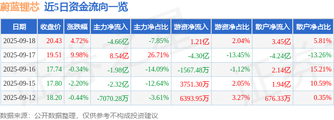 证券之星消息,截至2025年9月18日收盘,蔚蓝锂芯(002245)报收于20.43元,上涨4.72%,换手率27.14%,成交量294.49万手,成交额59.42亿元。