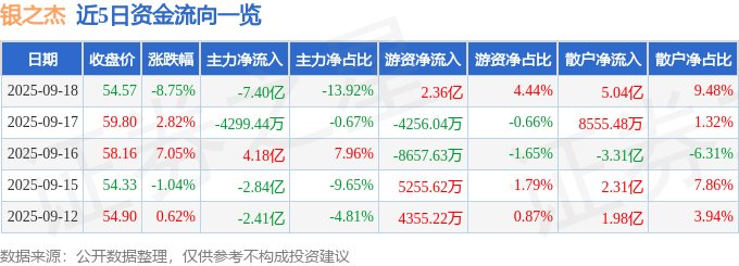 证券之星消息,截至2025年9月18日收盘,银之杰(300085)报收于54.57元,下跌8.75%,换手率14.64%,成交量95.48万手,成交额53.19亿元。