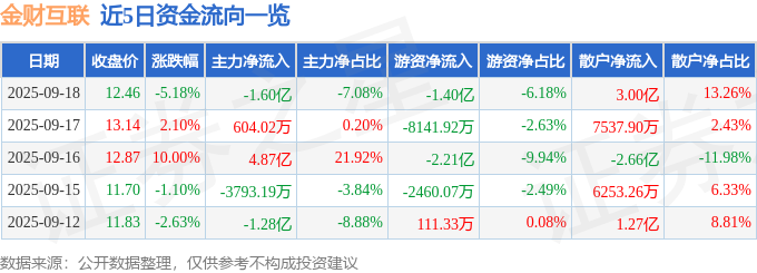 证券之星消息,截至2025年9月18日收盘,金财互联(002530)报收于12.46元,下跌5.18%,换手率25.75%,成交量178.96万手,成交额22.61亿元。
