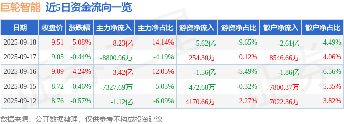 证券之星消息,截至2025年9月18日收盘,巨轮智能(002031)报收于9.51元,上涨5.08%,换手率31.12%,成交量603.29万手,成交额58.22亿元。
