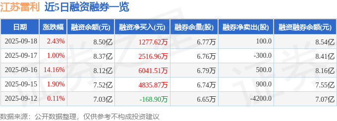 江苏雷利融资融券信息显示,融资方面,当日融资买入4.03亿元,融资偿还3.91亿元,融资净买入1277.62万元,连续3日净买入累计9836.08万元。融券方面,融券卖出900.0股,融券偿还800.0股,融券余量6.77万股,融券余额433.9万元。融资融券余额8.54亿元。