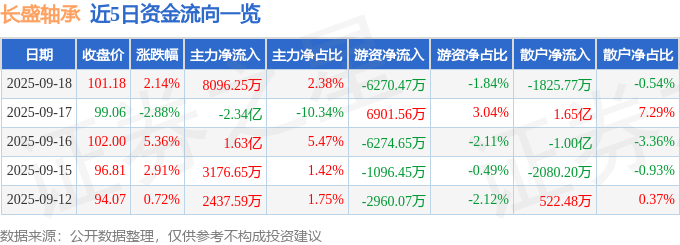 证券之星消息,截至2025年9月18日收盘,长盛轴承(300718)报收于101.18元,上涨2.14%,换手率17.13%,成交量33.2万手,成交额33.99亿元。