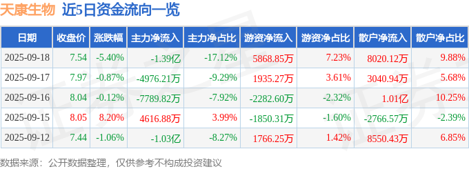 证券之星消息,截至2025年9月18日收盘,天康生物(002100)报收于7.54元,下跌5.4%,换手率7.78%,成交量106.22万手,成交额8.11亿元。