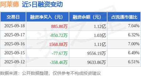 证券之星消息,9月18日,阿莱德(301419)融资买入5300.2万元,融资偿还4414.39万元,融资净买入885.8万元,融资余额1.12亿元。