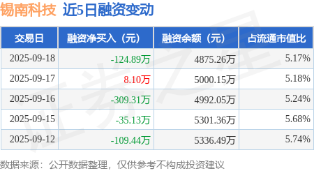 证券之星消息,9月18日,锡南科技(301170)融资买入464.53万元,融资偿还589.42万元,融资净卖出124.89万元,融资余额4875.26万元,近20个交易日中有11个交易日出现融资净买入。