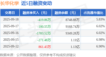 证券之星消息,9月18日,长华化学(301518)融资买入823.22万元,融资偿还1243.08万元,融资净卖出419.86万元,融资余额8748.88万元。