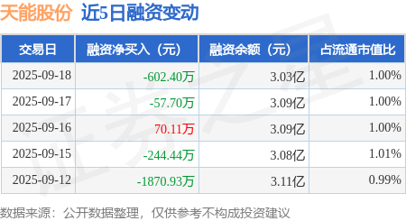 证券之星消息,9月18日,天能股份(688819)融资买入4399.56万元,融资偿还5001.96万元,融资净卖出602.4万元,融资余额3.03亿元,近20个交易日中有14个交易日出现融资净买入。