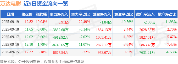 证券之星消息,万达电影9月19日涨停收盘,收盘价12.82元。该股于11点0分涨停,1次打开涨停,截止收盘封单资金为9537.49万元,占其流通市值0.36%。