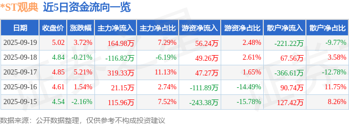 证券之星消息,截至2025年9月19日收盘,*ST观典(688287)报收于5.02元,上涨3.72%,换手率1.24%,成交量4.59万手,成交额2264.25万元。