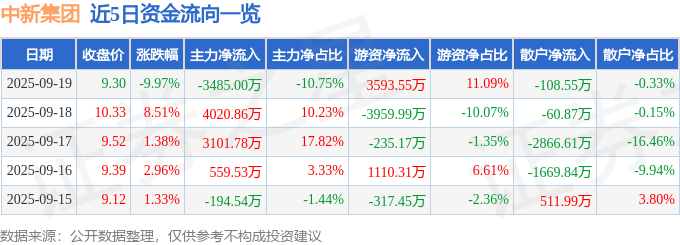 证券之星消息,截至2025年9月19日收盘,中新集团(601512)报收于9.3元,下跌9.97%,跌停,换手率2.26%,成交量33.8万手,成交额3.24亿元。
