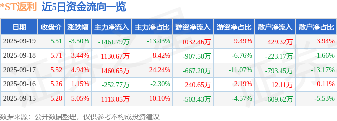 证券之星消息,截至2025年9月19日收盘,*ST返利(600228)报收于5.51元,下跌3.5%,换手率4.73%,成交量19.67万手,成交额1.09亿元。