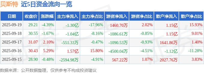 证券之星消息,截至2025年9月19日收盘,贝斯特(300580)报收于29.21元,下跌4.39%,换手率5.2%,成交量24.5万手,成交额7.22亿元。