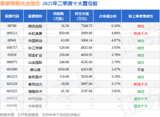 泰康策略优选混合的前十大重仓股如下: