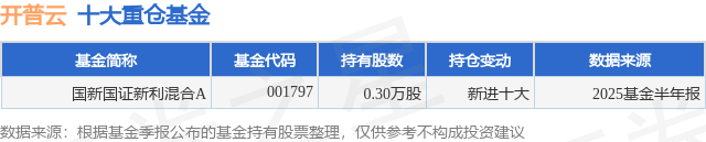 根据2025基金半年报公募基金重仓股数据,重仓该股的公募基金共1家,其中持有数量最多的公募基金为国新国证基金的国新国证新利混合A。国新国证新利混合A目前规模为0.19亿元,最新净值0.849(9月18日),较上一交易日下跌0.24%,近一年上涨18.74%。该公募基金现任基金经理为张洪磊。张洪磊在任的基金产品包括:国新国证新锐A,管理时间为2021年9月7日至今,期间收益率为46.98%;