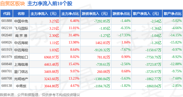 从资金流向上来看,当日自贸区板块主力资金净流入6.59亿元,游资资金净流出4.77亿元,散户资金净流出1.83亿元。自贸区板块个股资金流向见下表: