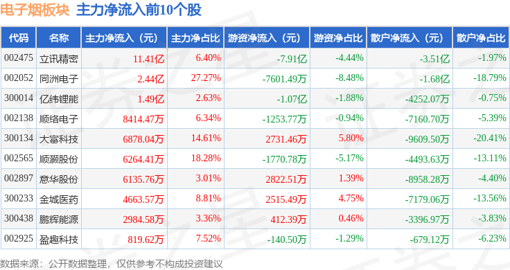 从资金流向上来看,当日电子烟板块主力资金净流出4.66亿元,游资资金净流出3.14亿元,散户资金净流入7.8亿元。电子烟板块个股资金流向见下表: