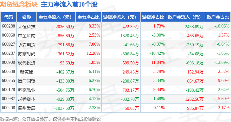 从资金流向上来看,当日期货概念板块主力资金净流出8.36亿元,游资资金净流出6208.01万元,散户资金净流入8.98亿元。期货概念板块个股资金流向见下表: