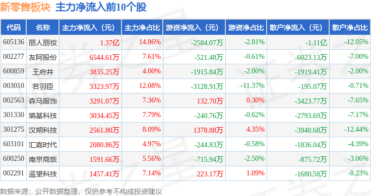 从资金流向上来看,当日新零售板块主力资金净流出6.34亿元,游资资金净流出1.58亿元,散户资金净流入7.92亿元。新零售板块个股资金流向见下表: