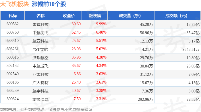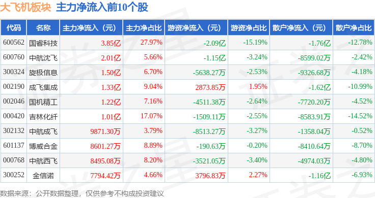 从资金流向上来看,当日大飞机板块主力资金净流出2.24亿元,游资资金净流出6.21亿元,散户资金净流入8.45亿元。大飞机板块个股资金流向见下表:
