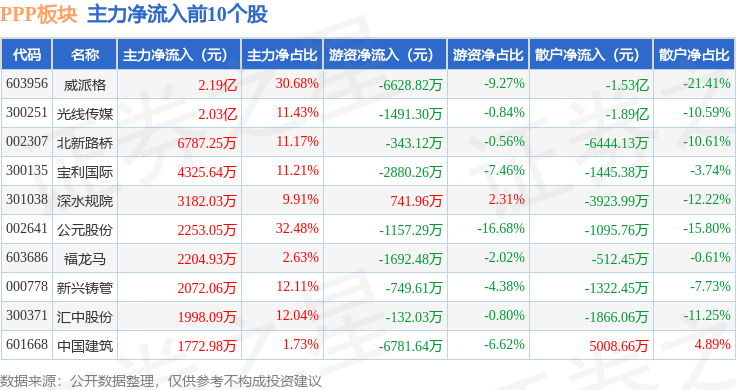 从资金流向上来看,当日PPP板块主力资金净流出15.9亿元,游资资金净流入4.41亿元,散户资金净流入11.49亿元。PPP板块个股资金流向见下表: