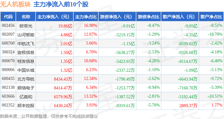 从资金流向上来看,当日无人机板块主力资金净流出9.97亿元,游资资金净流出4.68亿元,散户资金净流入14.66亿元。无人机板块个股资金流向见下表: