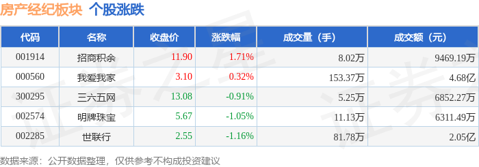 证券之星消息,9月19日房产经纪板块较上一交易日上涨0.42%,招商积余领涨。当日上证指数报收于3820.09,下跌0.3%。深证成指报收于13070.86,下跌0.04%。房产经纪板块个股涨跌见下表: