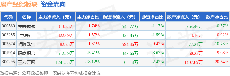 从资金流向上来看,当日房产经纪板块主力资金净流出535.46万元,游资资金净流出793.97万元,散户资金净流入1329.43万元。房产经纪板块个股资金流向见下表: