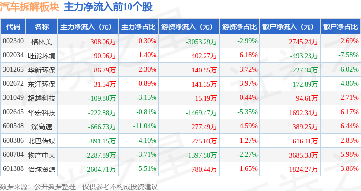 从资金流向上来看,当日汽车拆解板块主力资金净流出2.9亿元,游资资金净流出481.77万元,散户资金净流入2.95亿元。汽车拆解板块个股资金流向见下表:
