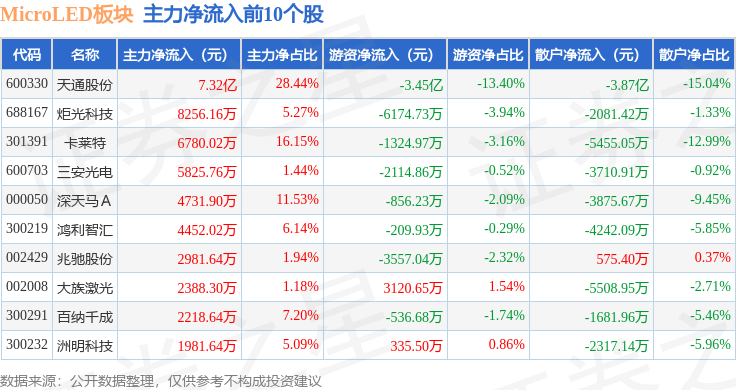 从资金流向上来看,当日MicroLED板块主力资金净流入5.16亿元,游资资金净流出3.66亿元,散户资金净流出1.5亿元。MicroLED板块个股资金流向见下表: