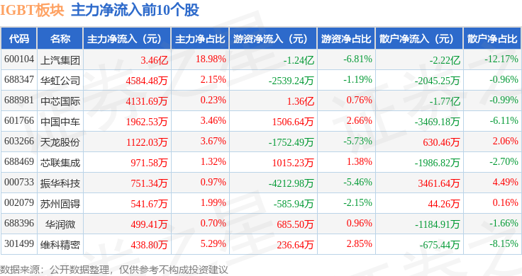 从资金流向上来看,当日IGBT板块主力资金净流出18.08亿元,游资资金净流入2.28亿元,散户资金净流入15.8亿元。IGBT板块个股资金流向见下表: