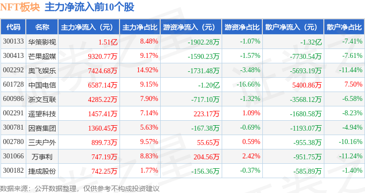 从资金流向上来看,当日NFT板块主力资金净流出14.23亿元,游资资金净流出1.58亿元,散户资金净流入15.81亿元。NFT板块个股资金流向见下表: