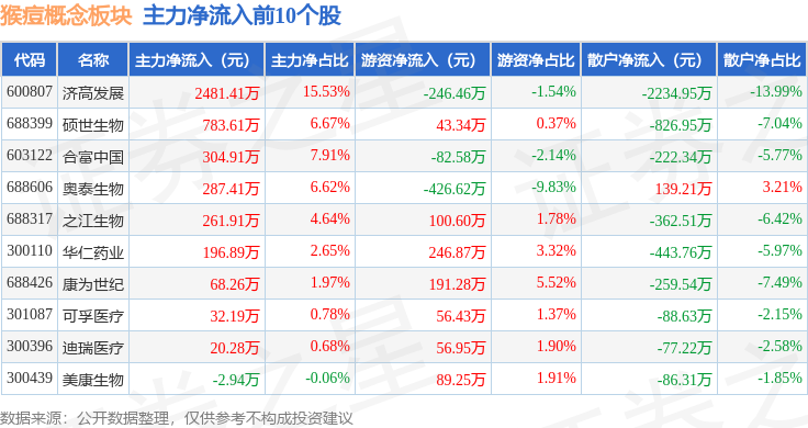 从资金流向上来看,当日猴痘概念板块主力资金净流出4.26亿元,游资资金净流入9644.74万元,散户资金净流入3.3亿元。猴痘概念板块个股资金流向见下表: