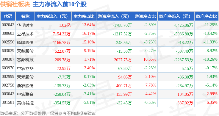 从资金流向上来看,当日供销社板块主力资金净流出9674.16万元,游资资金净流入1991.25万元,散户资金净流入7682.91万元。供销社板块个股资金流向见下表: