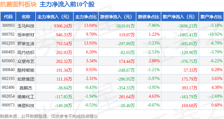 从资金流向上来看,当日抗菌面料板块主力资金净流出999.38万元,游资资金净流出8471.7万元,散户资金净流入9471.07万元。抗菌面料板块个股资金流向见下表: