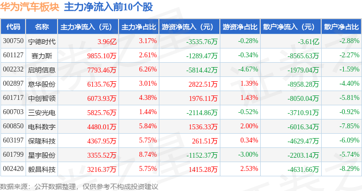 从资金流向上来看,当日华为汽车板块主力资金净流出62.22亿元,游资资金净流入12.49亿元,散户资金净流入49.73亿元。华为汽车板块个股资金流向见下表: