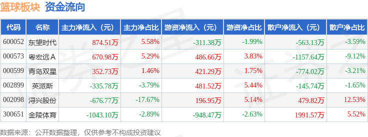 从资金流向上来看,当日篮球板块主力资金净流出157.44万元,游资资金净流入326.58万元,散户资金净流出169.14万元。篮球板块个股资金流向见下表: