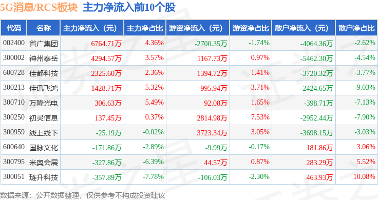 从资金流向上来看,当日5G消息/RCS板块主力资金净流出11.92亿元,游资资金净流入2.44亿元,散户资金净流入9.48亿元。5G消息/RCS板块个股资金流向见下表: