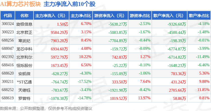 从资金流向上来看,当日AI算力芯片板块主力资金净流出32.86亿元,游资资金净流入16.83亿元,散户资金净流入16.03亿元。AI算力芯片板块个股资金流向见下表: