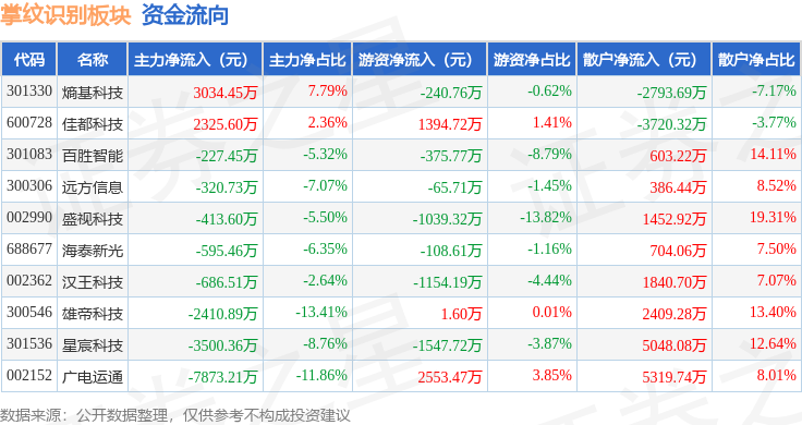 从资金流向上来看,当日掌纹识别板块主力资金净流出1.07亿元,游资资金净流出582.3万元,散户资金净流入1.13亿元。掌纹识别板块个股资金流向见下表: