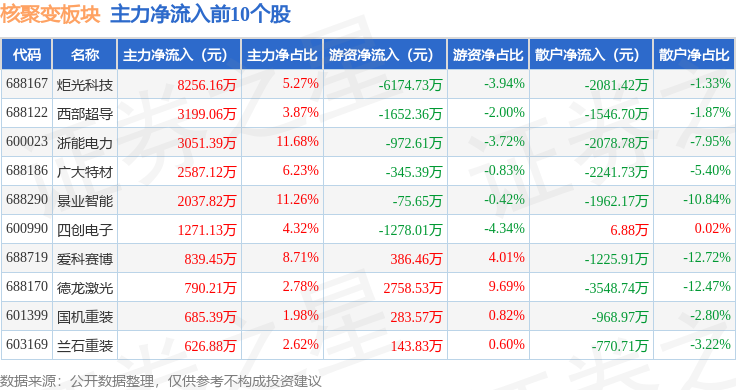 从资金流向上来看,当日核聚变板块主力资金净流出10.38亿元,游资资金净流出1616.44万元,散户资金净流入10.54亿元。核聚变板块个股资金流向见下表: