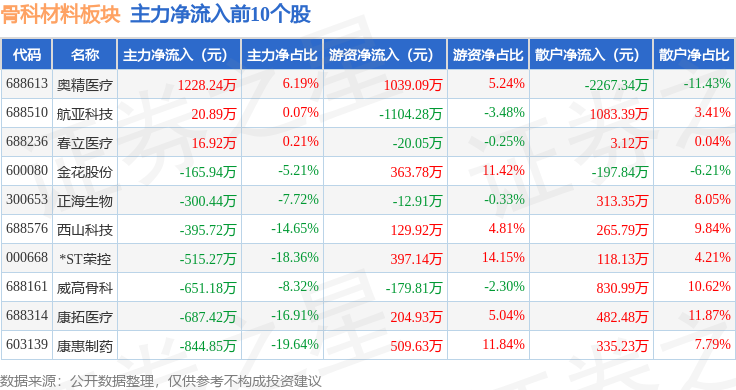 从资金流向上来看,当日骨科材料板块主力资金净流出4.66亿元,游资资金净流入9595.56万元,散户资金净流入3.7亿元。骨科材料板块个股资金流向见下表: