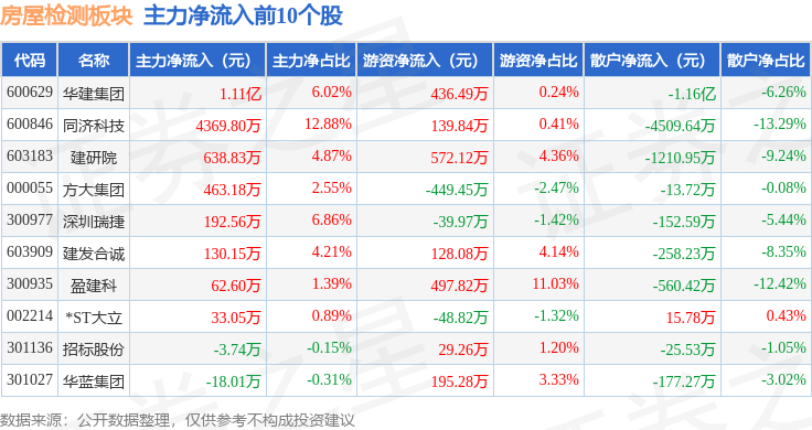 从资金流向上来看,当日房屋检测板块主力资金净流出6.49亿元,游资资金净流入1.94亿元,散户资金净流入4.56亿元。房屋检测板块个股资金流向见下表: