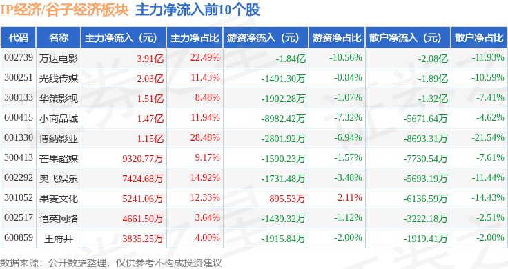 从资金流向上来看,当日IP经济/谷子经济板块主力资金净流出1.47亿元,游资资金净流出3.17亿元,散户资金净流入4.64亿元。IP经济/谷子经济板块个股资金流向见下表: