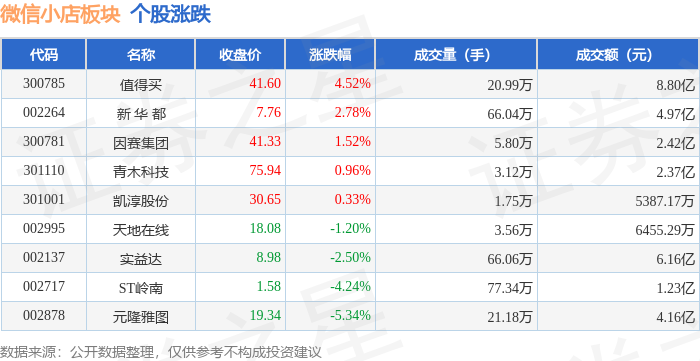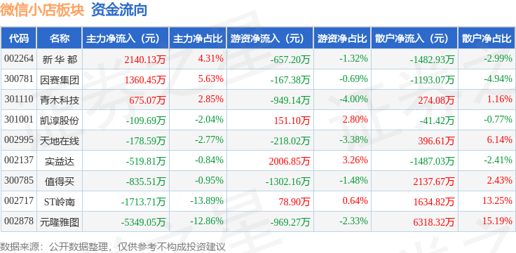 从资金流向上来看,当日微信小店板块主力资金净流出4530.71万元,游资资金净流出2026.32万元,散户资金净流入6557.03万元。微信小店板块个股资金流向见下表: