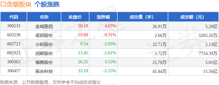 证券之星消息,9月19日口含烟板块较上一交易日下跌2.7%,赢合科技领跌。当日上证指数报收于3820.09,下跌0.3%。深证成指报收于13070.86,下跌0.04%。口含烟板块个股涨跌见下表: