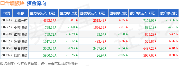 从资金流向上来看,当日口含烟板块主力资金净流出6861.63万元,游资资金净流入1124.82万元,散户资金净流入5736.81万元。口含烟板块个股资金流向见下表: