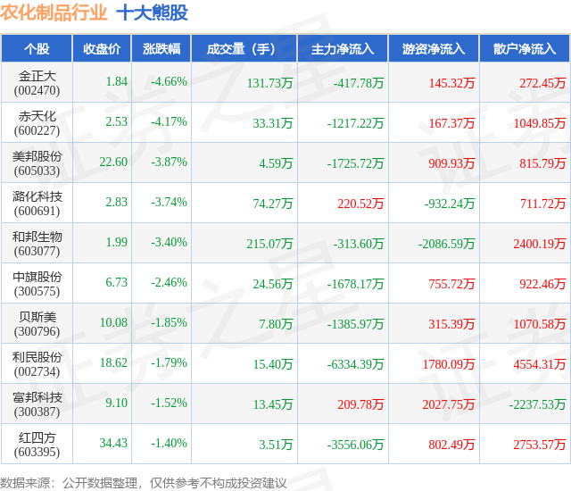 个股表现方面,农化制品行业当日领跌股为金正大(002470),该股当日报收1.84,下跌4.66%,成交量131.73万,主力资金净流出417.78万元。赤天化(600227)以下跌4.17%紧随其后,该股当日成交量33.31万,主力资金净流出1217.22万元。除此之外,美邦股份(605033)、潞化科技(600691)、和邦生物(603077)均进入当日熊股之列。具体个股列表见下表: